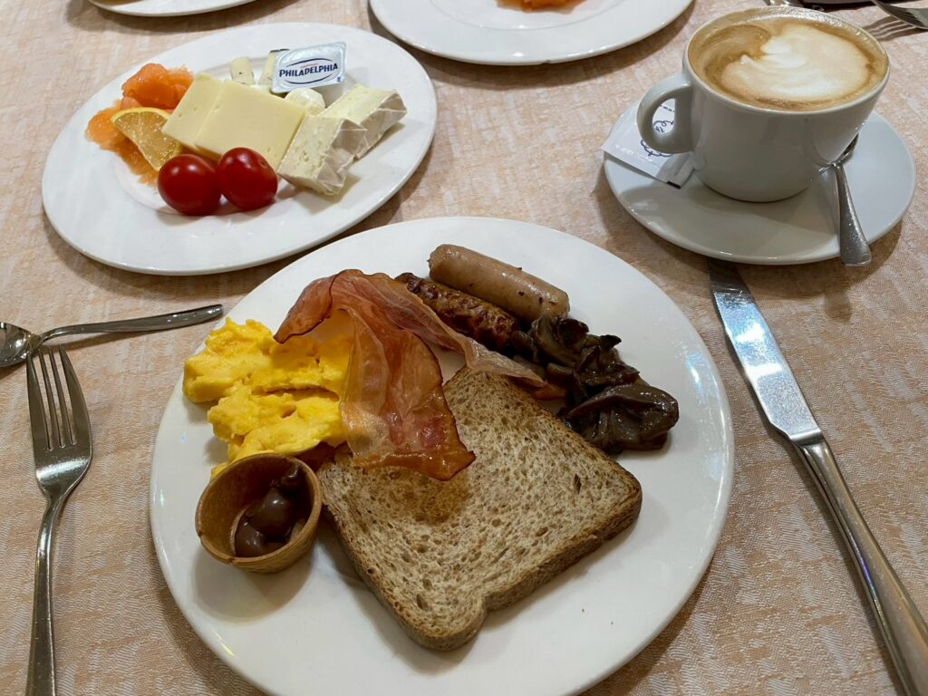 朝食を付けていたので、レストランに向かいます。陽気なホテル員さんに案内され、レストランに入ると、ブッフェ形式の朝食が並んでいました。
